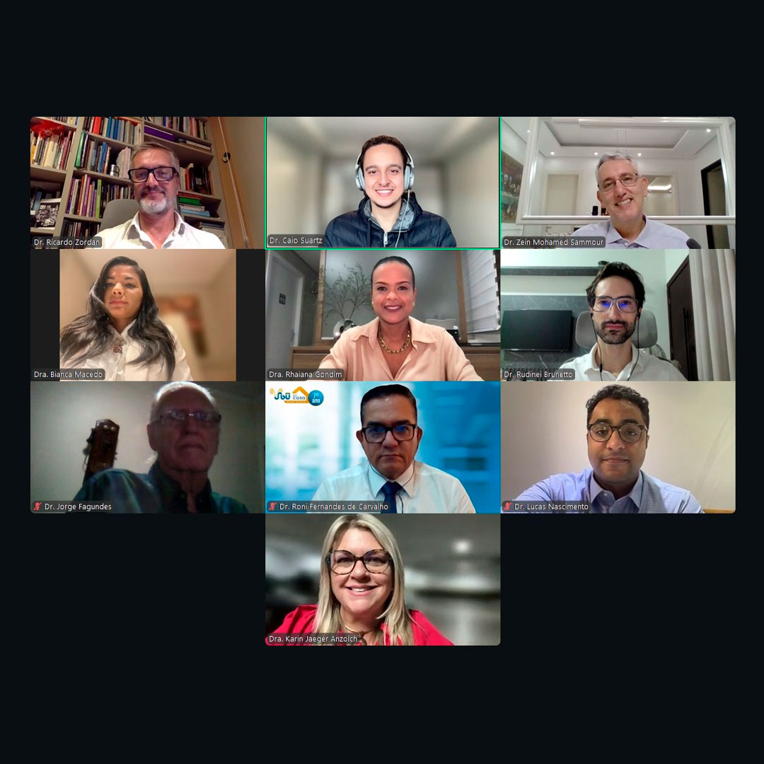 Drs. Karin Anzolch e Caio Suartz foram os coordenadores gerais, Dr. Rudinei Brunetto, coordenador, Dr. Zein Sammour, moderador e Drs. Jorge Fagundes, Ricardo Zordan, Rhaiana Gondim e Bianca Macedo, debatedores. Dr. Roni Fernandes conduziu a abertura do webinar.
