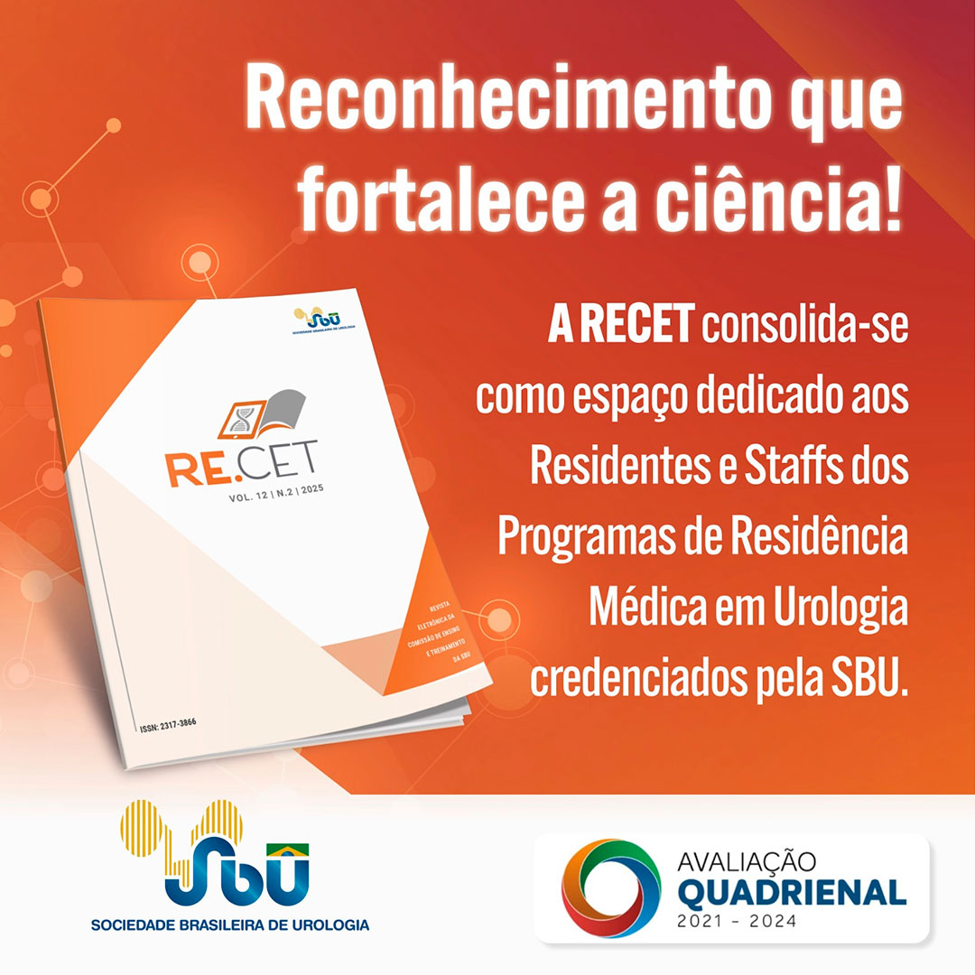 Publicada de forma contínua há 10 anos, a RECET consolida-se como espaço dedicado aos residentes e staffs dos programas de Residência Médica em Urologia credenciados pela SBU a quem, de modo especial, os editores, os membros da CET, a equipe técnica editorial e de publicações da SBU agradecem. Nosso reconhecimento aos nossos revisores, fundamentais para o nosso compromisso com o crescimento e qualidade das publicações.